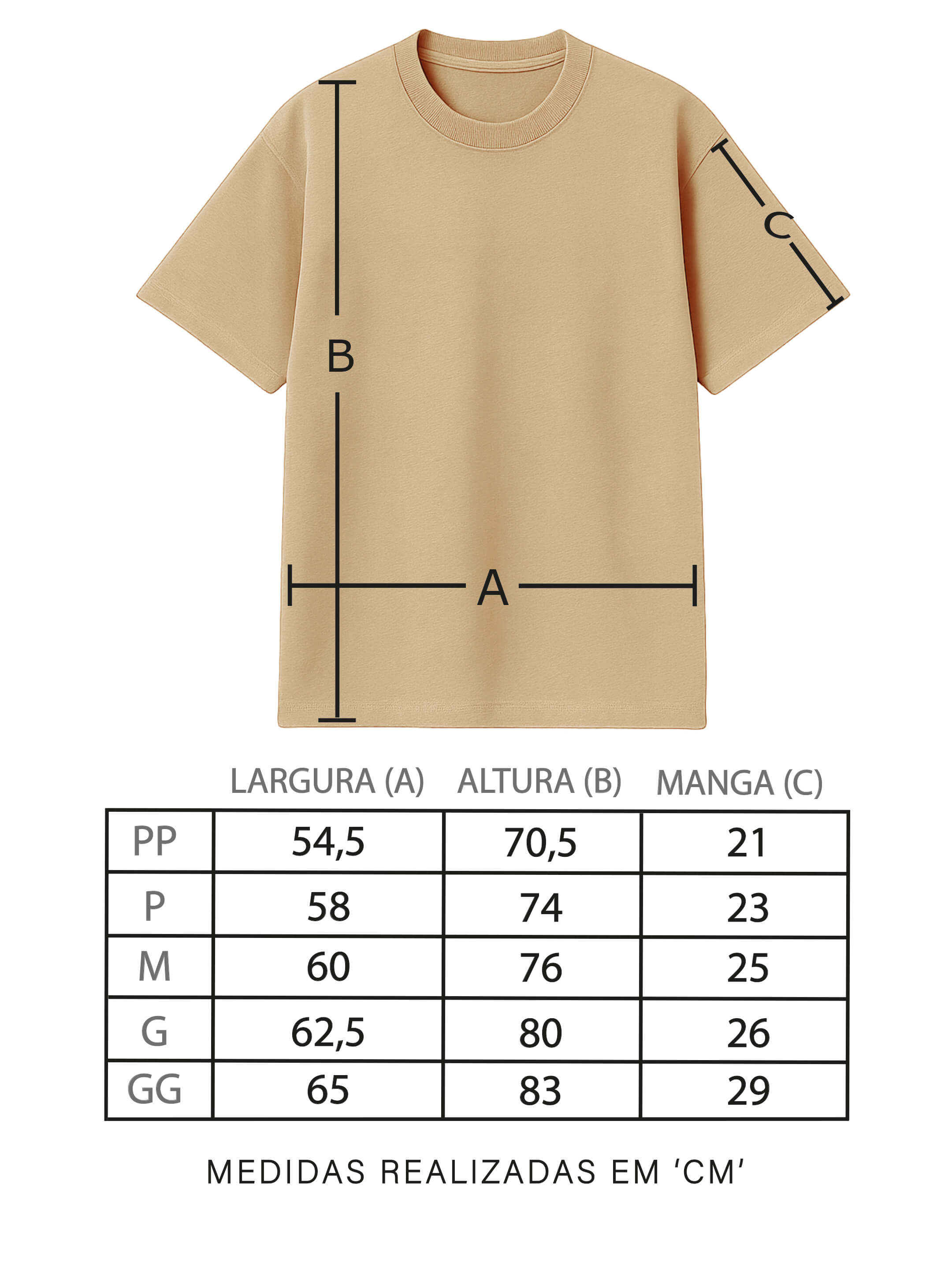 Camiseta Oversized Heavy Areia, disponível no PP, P, M, G e GG. Produzida em modelagem Oversized e com extrema qualidade.