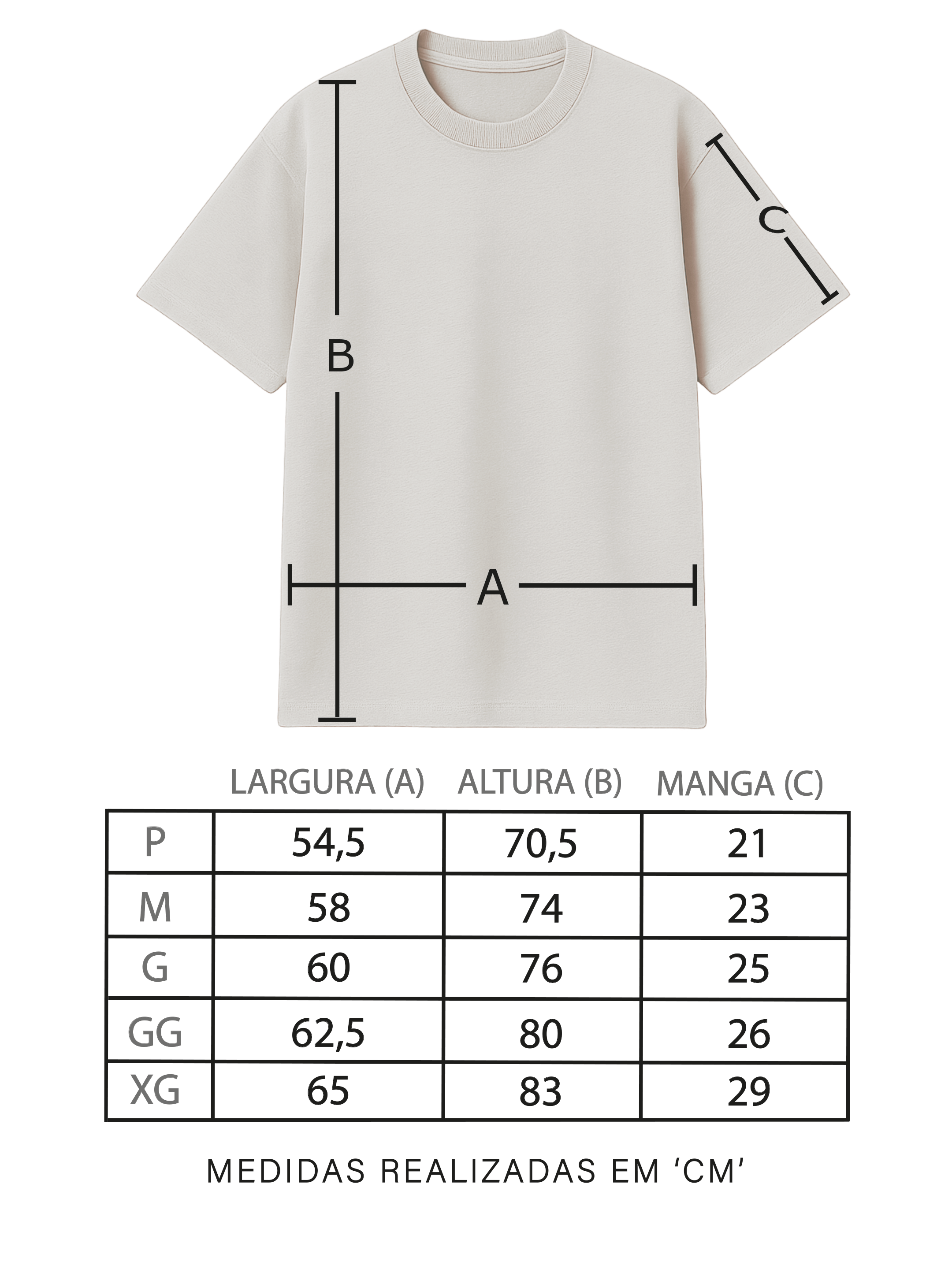 A modelagem oversized consiste em ser maior que modelagem convencionais. Recomendamos pegar o mesmo tamanho para manter a proposta. Caso prefira peças mais ajustadas, recomendamos pegar um tamanho abaixo do que costuma usar.