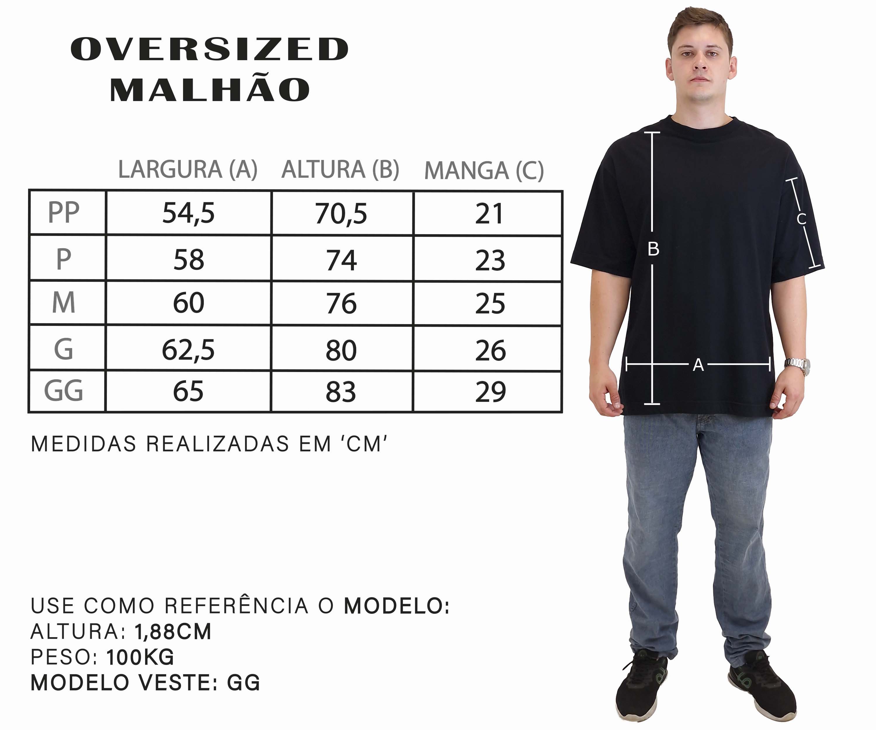 A modelagem oversized consiste em ser maior que modelagem convencionais. Recomendamos pegar o mesmo tamanho para manter a proposta. Caso prefira peças mais ajustadas, recomendamos pegar um tamanho abaixo do que costuma usar.