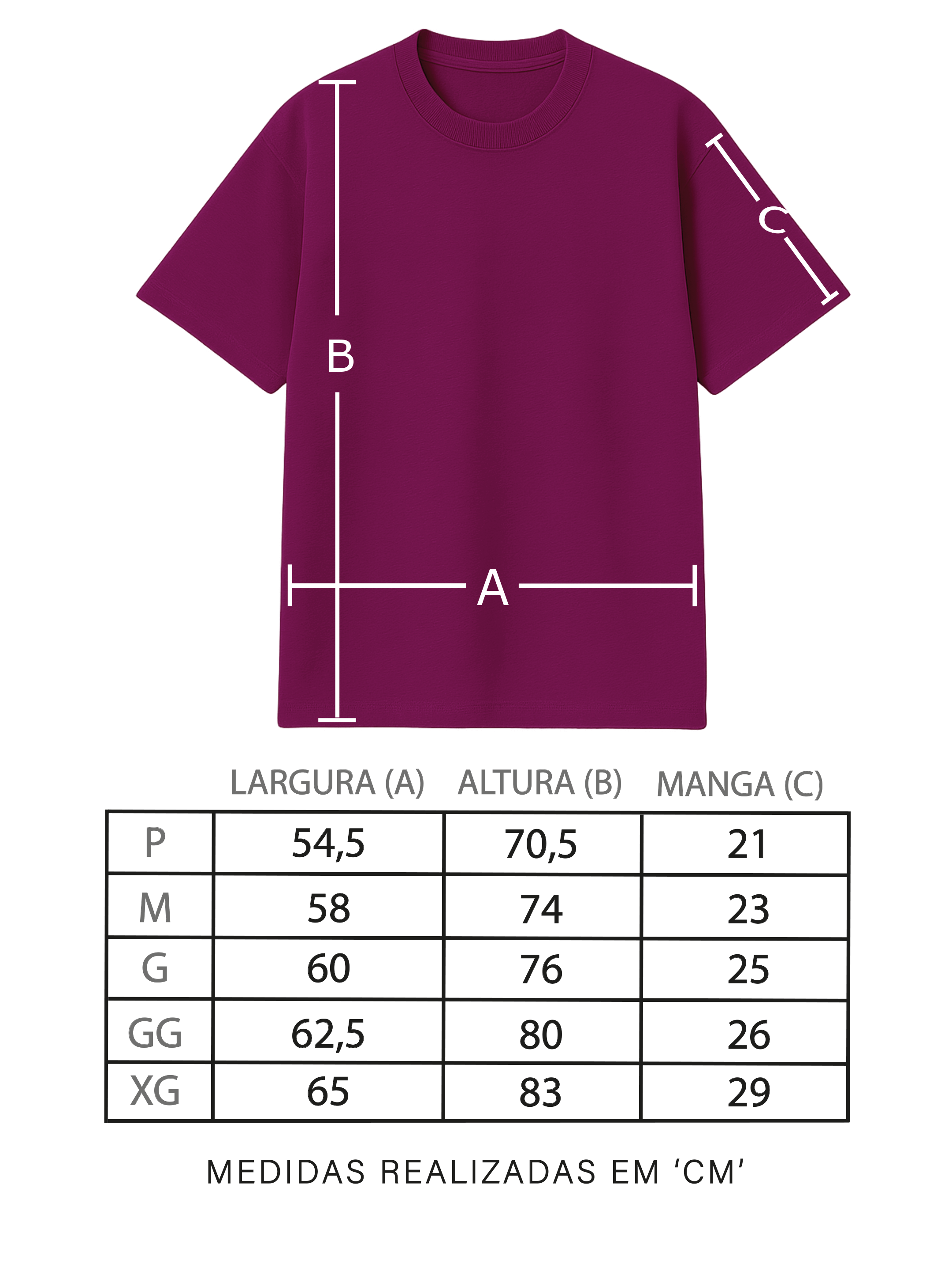 A modelagem oversized consiste em ser maior que modelagem convencionais. Recomendamos pegar o mesmo tamanho para manter a proposta. Caso prefira peças mais ajustadas, recomendamos pegar um tamanho abaixo do que costuma usar.