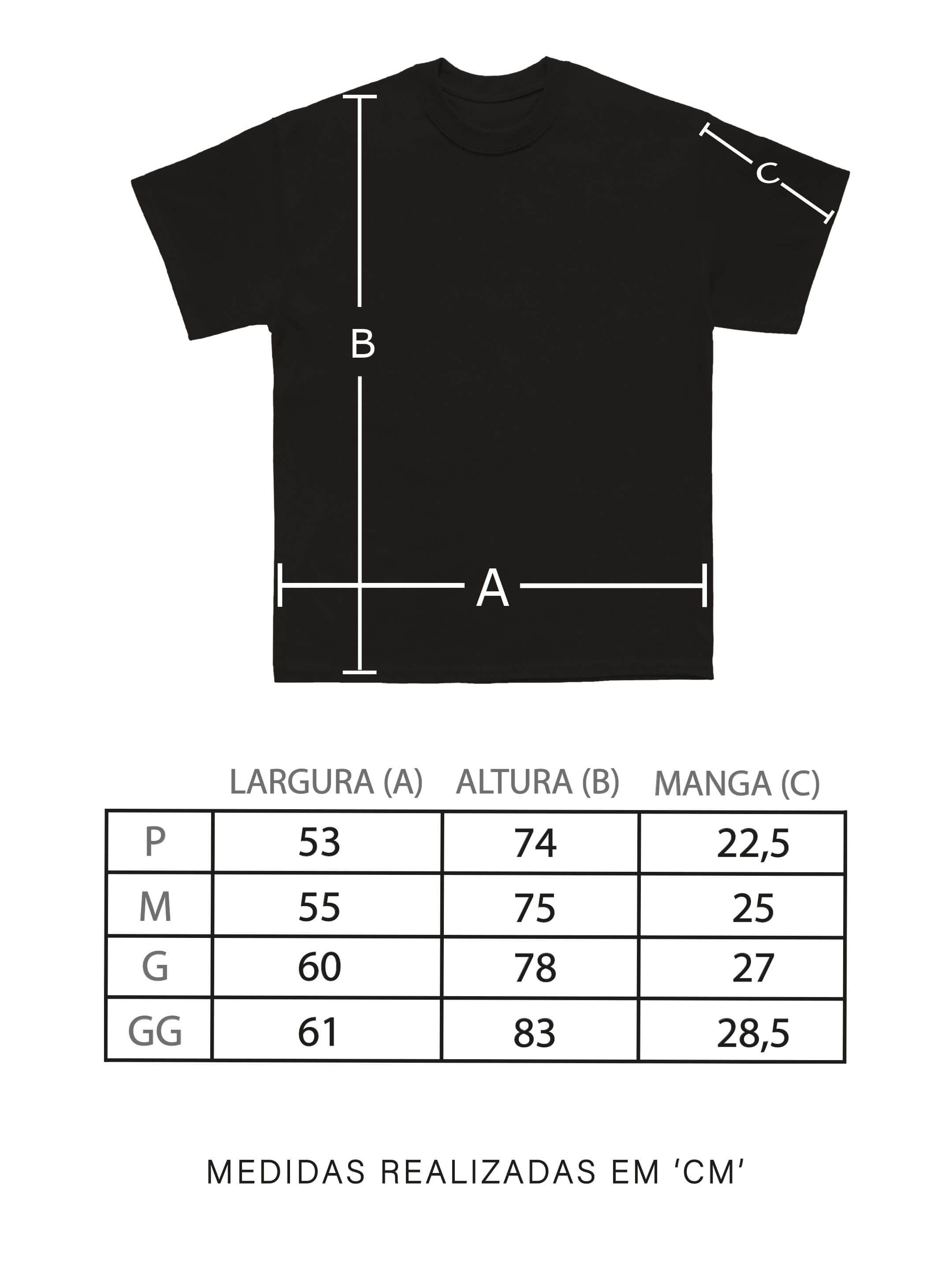 A modelagem oversized consiste em ser maior que modelagem convencionais. Recomendamos pegar o mesmo tamanho para manter a proposta. Caso prefira peças mais ajustadas, recomendamos pegar um tamanho abaixo do que costuma usar.
